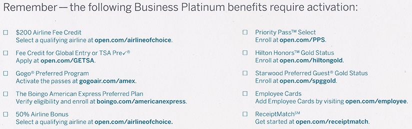 Included with my American Express Business Platinum Charge Card was a detailed benefits guide with all the features of the card. This is the most important page in the pamphlet. Remember to activate the following benefits if they interest you – none of these benefits are activated automatically.