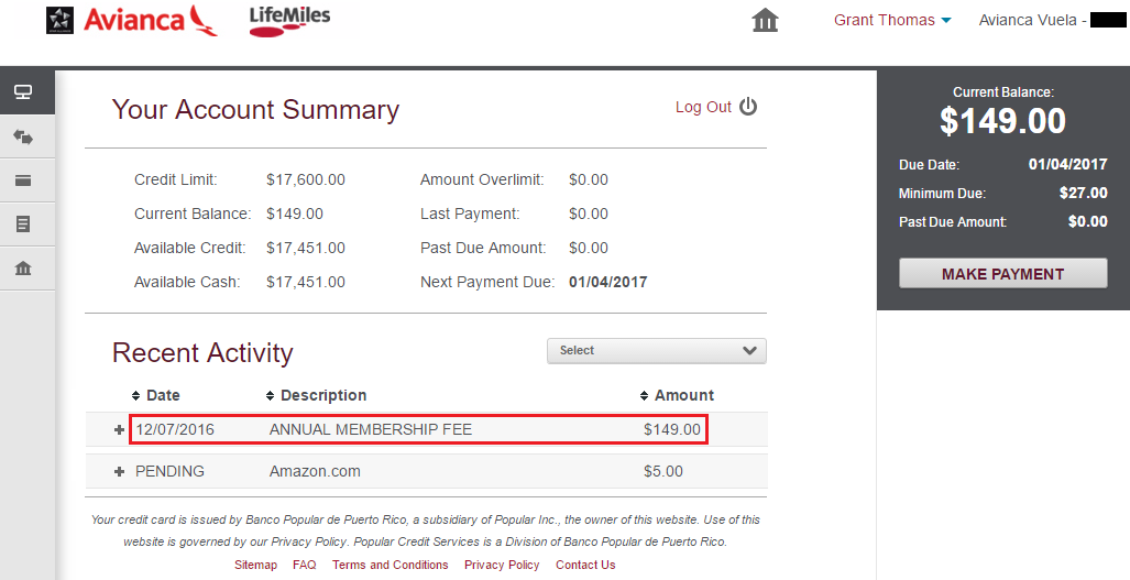 I logged into my Avianca Vuela Credit Card online account again. The $149 annual fee and the $5 pending charge on Amazon were both shown.
