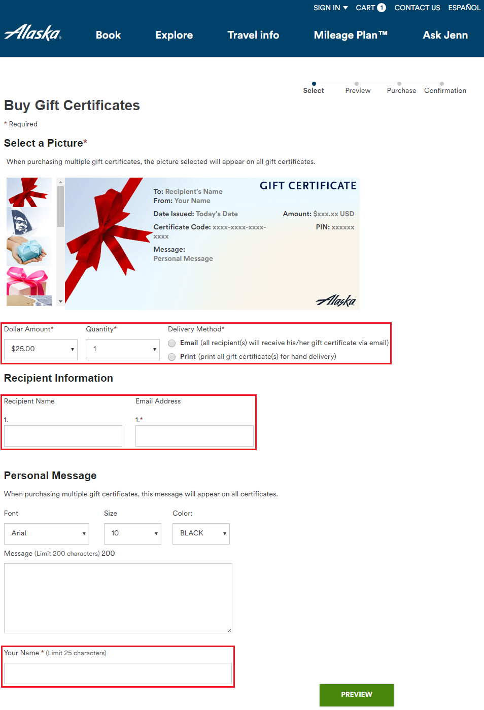 Fill out the gift certificate form and select email delivery.  I skipped over the next few steps about signing into your Alaska Airlines account and paying with a credit card.