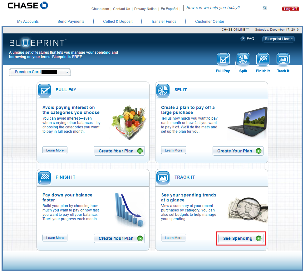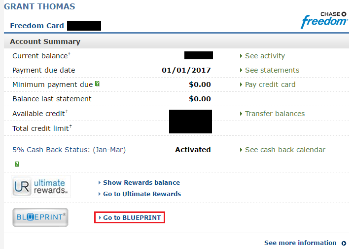 Up next, we have the Chase Freedom.  Log into your Chase online account and click on the Go to Blueprint link under your Chase Freedom account.