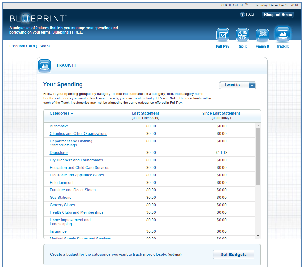 You will see all purchases that post in those categories for the last several months.  Since we only care about Q4, look at all purchases from October to December.  As you can see, my Chase Freedom hasn’t gotten much use this quarter.  Add up the monthly totals from October to December in these 3 categories to see where you stand.  If you are under $1,500, decide if it is worth spending at those categories to max them out.