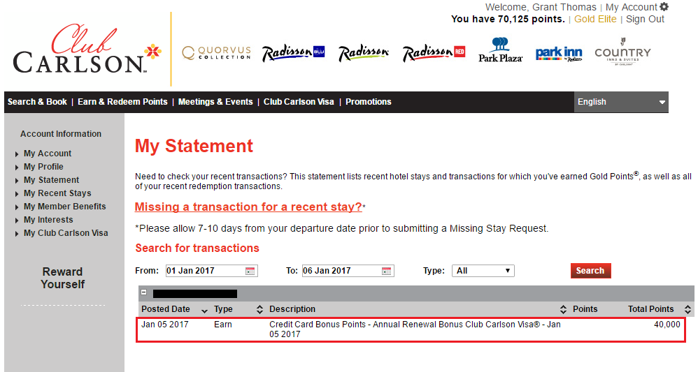 So there you have it. After you pay the annual fee, wait ~2 months (or 2 statements) and you will have 40,000 anniversary points in your Club Carlson account. Also, you can transfer Club Carlson points to another Club Carlson account instantly and for free by calling Club Carlson. I called Club Carlson this morning and transferred all the points from my personal Club Carlson account to my business Club Carlson account so I could book a multi-night reservation from the same account. If you have any questions about Club Carlson points, please let me know. Have a great day everyone!