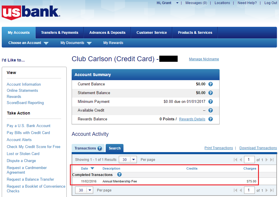 Up next, let’s look at the US Bank Club Carlson Business Credit Card. The $60 annual fee posted on July 6, 2016…