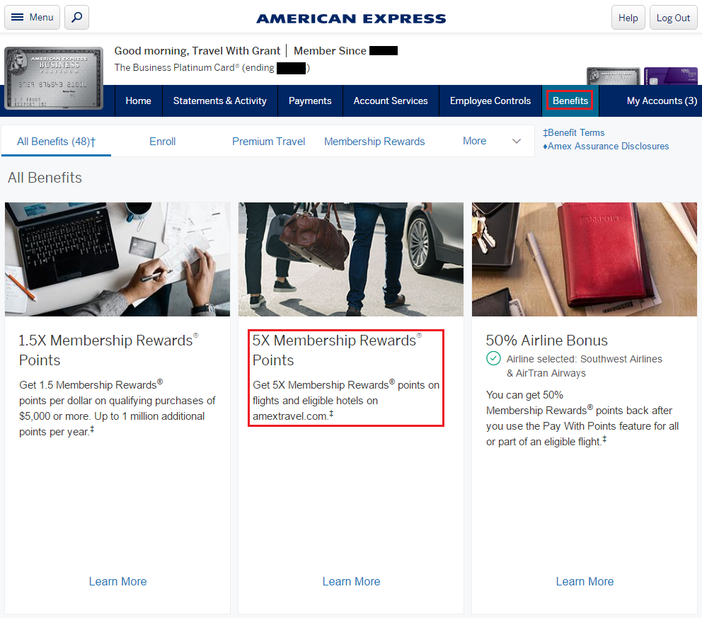 You will get one point for each dollar charged for an eligible purchase on your Business Platinum Card® from American Express. You will get 4 additional points (for a total of 5 points) for each dollar spent on eligible travel purchases made on amextravel.com. Eligible travel purchases include the following purchases made on amextravel.com: scheduled flights, prepaid hotel purchases (including The Hotel Collection), travel packages (flight + hotel packages), minus returns and other credits. Flights and eligible hotel reservations must be made on or after 3/30/2017 for additional points. Eligible travel purchases do NOT include FINE HOTELS & RESORTS bookings, car or cruise purchases, hotel group reservations or events, ticketing service, cancellation or other fees, interest charges, purchases of travelers checks, purchases or reloading of prepaid cards, or purchases of other cash equivalents. To be eligible for the 5x Membership Rewards® points, you must both reserve and charge the travel purchase with the same eligible Business Platinum Card®. To modify a reservation you must cancel and rebook your reservation. You can cancel and rebook your reservation on amextravel.com or by calling a representative of amextravel.com at 1-800-297-2977. Cancellations are subject to hotel cancellation penalty policies. If hotel reservations are made or modified directly with the hotel provider, the reservation will not be eligible for this 5X Membership Rewards® point benefit. Extra points for air, prepaid hotel, and travel packages will be credited to the Membership Rewards account 10-12 weeks after final payment is made. Bonuses you may receive with your Card on other purchase categories or in connection with promotions or offers from American Express may not be combined with this benefit. Merchants are assigned codes based on what they primarily sell. A purchase will not qualify for additional points if the merchant’s code is not eligible. The benefits associated with the Additional Card(s) you choose may be different than the benefits associated with your basic Card.