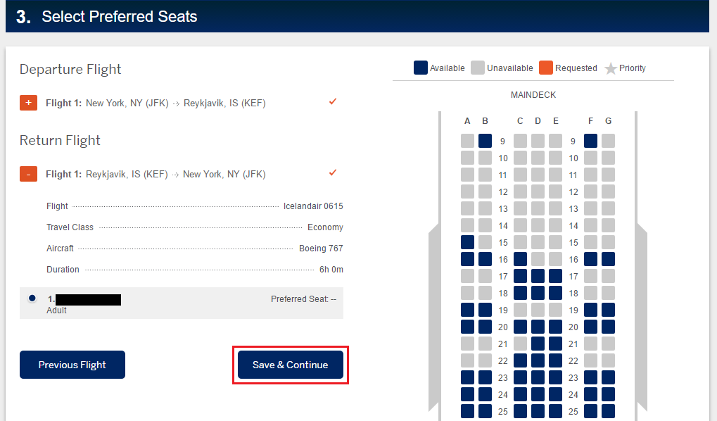 Enter the traveler’s personal information, then click the Save & Continue button. In this case, I do not have an Icelandair Saga Club frequent flyer number, so I left that section blank.
