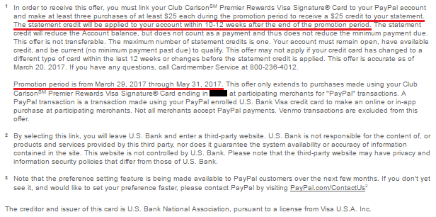 Good morning everyone. At the end of March, I wrote this blog post: Targeted Q2 Credit Card Offers Part 2: 10,000 JetBlue TrueBlue Points & US Bank Club Carlson $25 Statement Credit. Yesterday, I covered the first offer from that post: 5 Months Later, I Received 10,000 Bonus JetBlue Points from Barclays JetBlue Plus Credit Card Promo. Today, I will cover the second offer. It was a pretty simple offer: make 3 PayPal payments of $25 or more with your US Bank Club Carlson Credit Card and get a $25 statement credit.